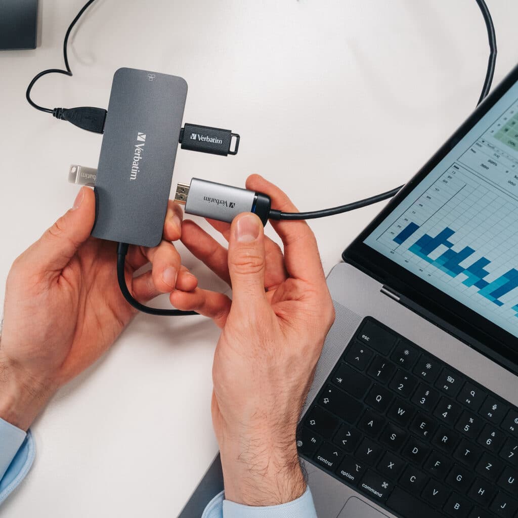 No one wants to juggle cables and adapters right before a big presentation. The Verbatim 5 Port Pro Hub helps you stay connected with ease, offering HDMI output, USB-A ports, and a USB-C power delivery port so you can connect your laptop to displays and charge at the same time.