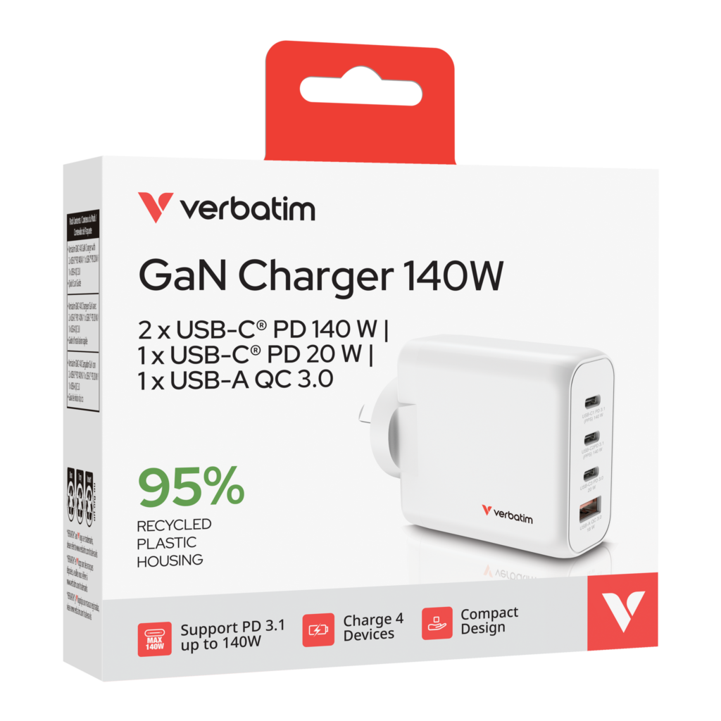 Verbatim’s 140W GaN Wall Charger consolidates multiple chargers into one, combining two USB-C PD 140W ports, one USB-C PD 20W port and one USB-A QC 3.0 port in a sleek, palm sized design. Ideal for the office, home or travelling to power your laptop, tablet, smartphone, gaming devices, and more. Constructed with 95% post-consumer recycled plastic housing and comes with 100% plastic-free packaging.