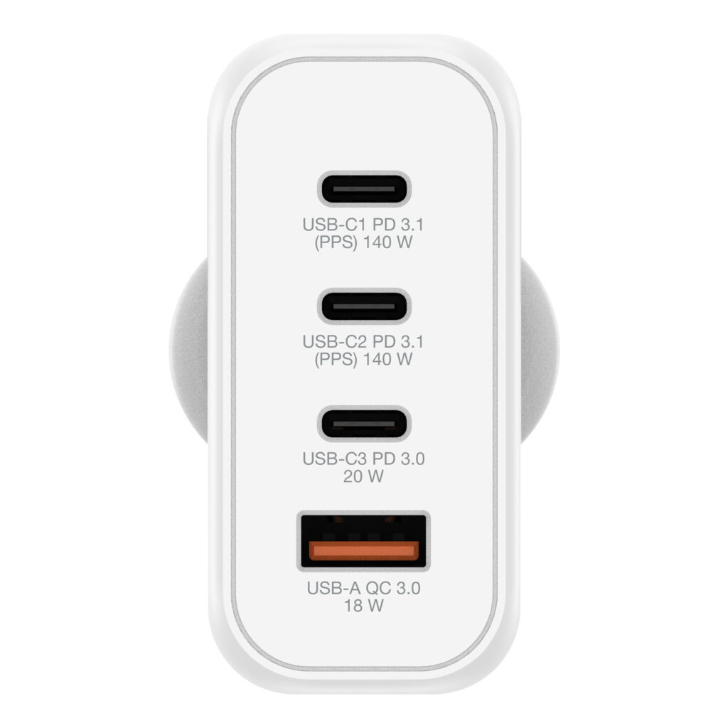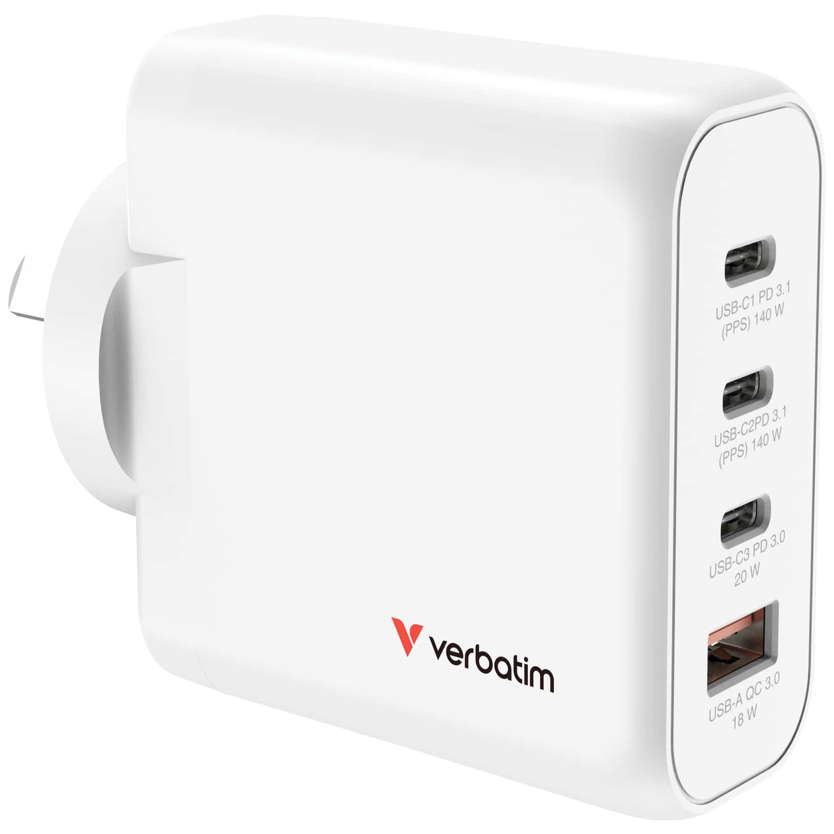Verbatim’s 140W GaN Wall Charger combines two USB-C PD 140W ports, one USB-C PD 20W port and one USB-A QC 3.0 port in a sleek, palm sized design. Ideal for the office, home or travelling to power your laptop, tablet, smartphone, gaming devices, and more.