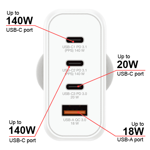 - USB-C1/C2 PD 3.1 (PPS supported): 3.3 – 21 V ⎓ 5 A, 5 V ⎓ 3 A, 9 V ⎓ 3 A, 12 V ⎓ 3 A, 15 V ⎓ 3 A, 20 V ⎓ 5A, 28 V ⎓ 5 A (140 W Max.)