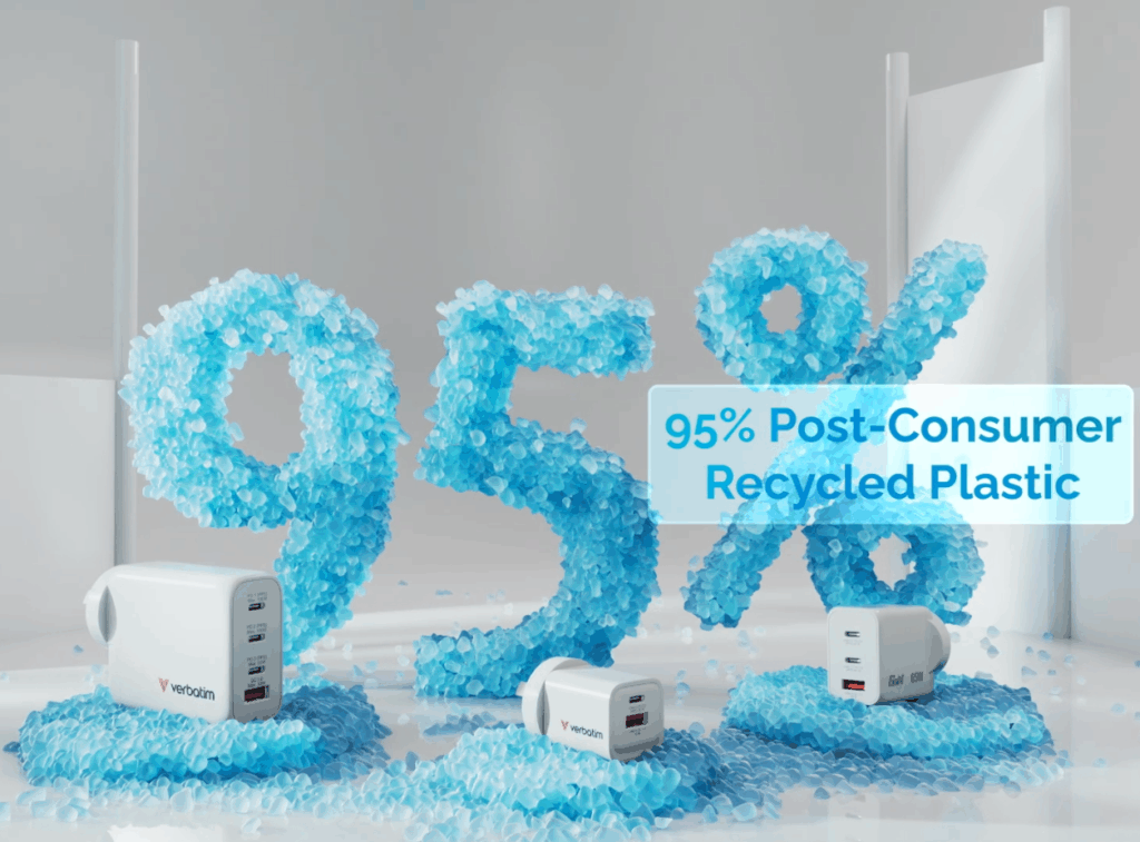 Verbatim’s 140W GaN Charger features a housing constructed from 95% PCR plastic.