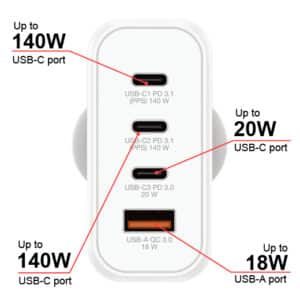 - USB-C1/C2 PD 3.1 (PPS supported): 3.3 – 21 V ⎓ 5 A, 5 V ⎓ 3 A, 9 V ⎓ 3 A, 12 V ⎓ 3 A, 15 V ⎓ 3 A, 20 V ⎓ 5A, 28 V ⎓ 5 A (140 W Max.)