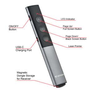 The Wireless Presenter is built for versatility and convenience, featuring a dual USB-A and USB-C receiver that connects effortlessly to Mac, PC, and Android devices. With plug-and-play functionality, there’s no need for drivers or complicated setup – just plug in and start presenting instantly. The high-visibility red laser pointer, with a range of up to 100 meters, ensures precision in directing attention, making it ideal for large venues and professional environments.