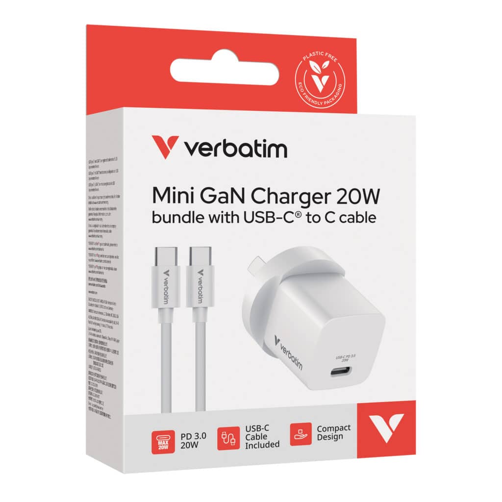 Power up straight out of the box with the Verbatim Mini GaN 20W Charger Bundle. Designed for modern devices, this compact, efficient charger comes paired with a USB-C to USB-C cable, giving users everything they need to charge and sync without purchasing extras.