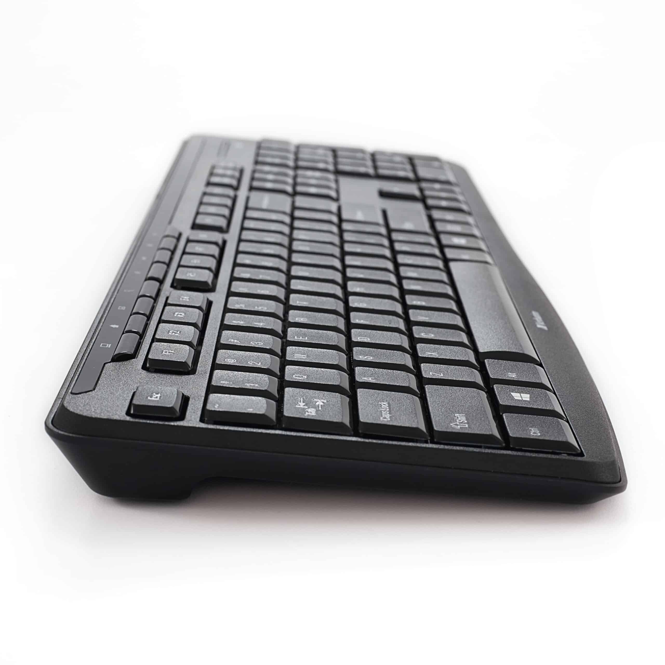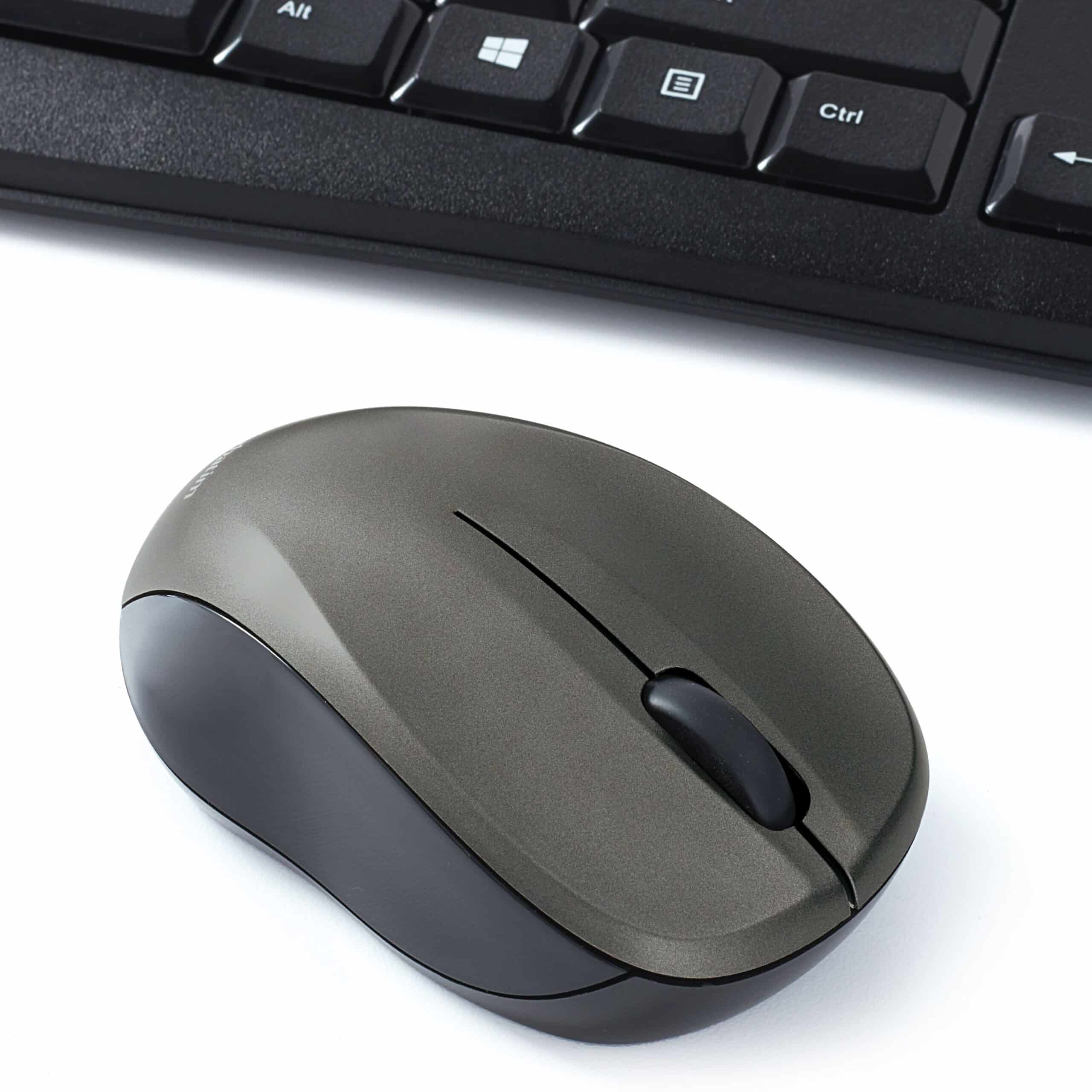 The wireless 2.4GHz connection ensures smooth, lag-free performance, while the plug-and-forget nano receiver is small enough to stay connected without getting in the way. The Silent Mouse is equipped with advanced Blue LED technology, giving you precise control on a wide range of surfaces – from your desk to a glass tabletop or even a granite counter. The Silent Keyboard combines a slim, space-efficient design with a full numeric keypad and full-size function keys, making it as practical as it is quiet.
