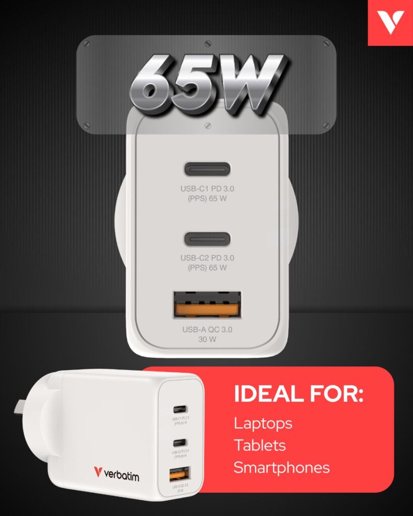 Every Verbatim GaN charger supports USB-C Power Delivery, intelligent power distribution and advanced safety protection, and is engineered to meet Australian safety and compliance standards. Featuring high-quality, flame-resistant construction, plus over-current, over-voltage, short circuit and over-temperature protection, the range is designed to give you confidence that your devices are charging safely, efficiently and reliably.
